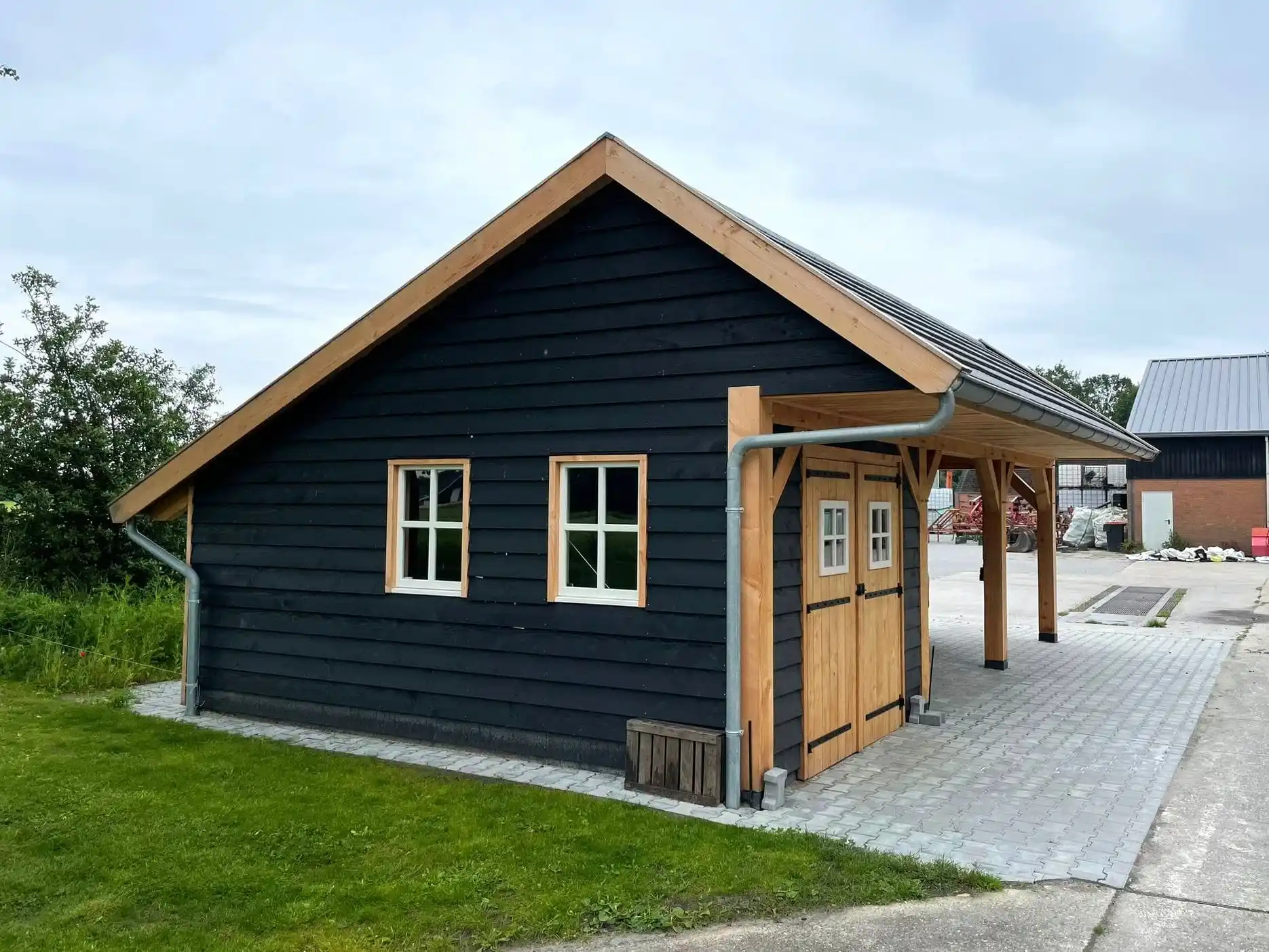 Deze Drentse kapschuur is een compacte en solide uitvoering met een duidelijke, rustige vormgeving. De lage nokhoogte houdt het geheel bescheiden van proportie, terwijl de draaideuren en ramen zorgen voor een prettige toegankelijkheid en natuurlijke lichtinval.