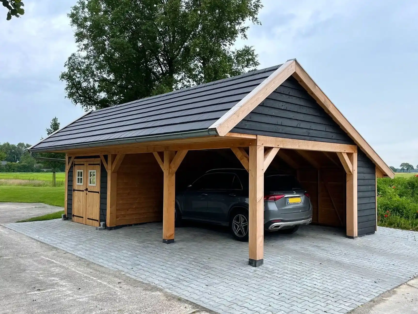 De constructie met Douglas kantrechte gevelpanken en kolommen geeft een verzorgde en duurzame uitstraling. Nieuwe keramische dakpannen zorgen voor een tijdloze afwerking die past bij uiteenlopende omgevingen. Een functionele en karaktervolle kapschuur met praktische inzetmogelijkheden.