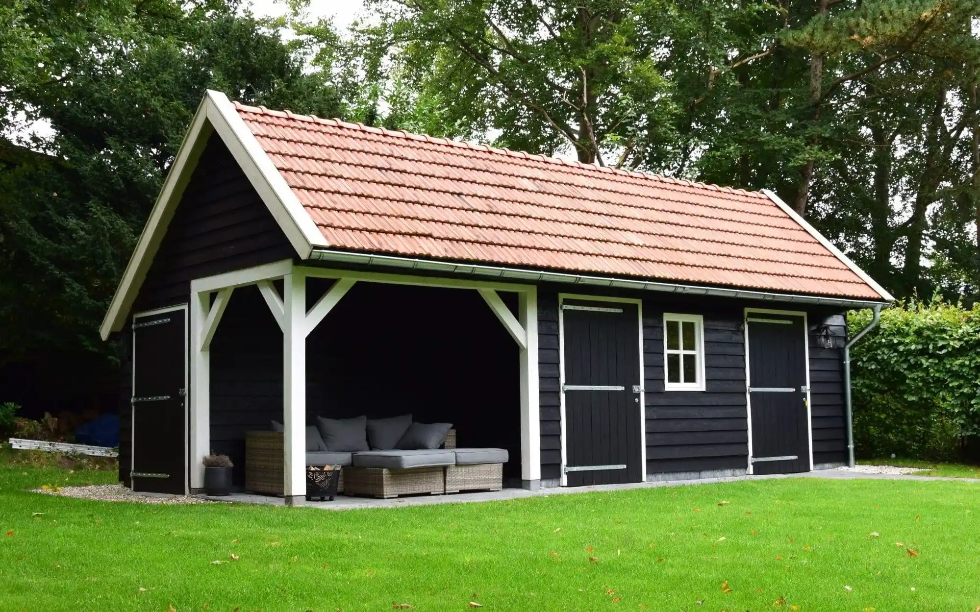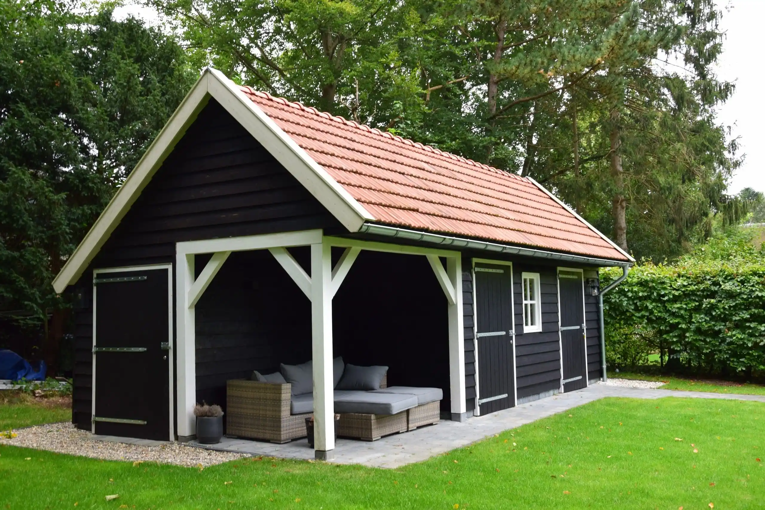De aanwezigheid van drie afzonderlijke loopdeuren maakt het model bijzonder praktisch in gebruik. De hardhouten ramen zorgen voor daglicht in de ruimte, terwijl de oude keramische dakpannen het geheel een klassieke afwerking geven.