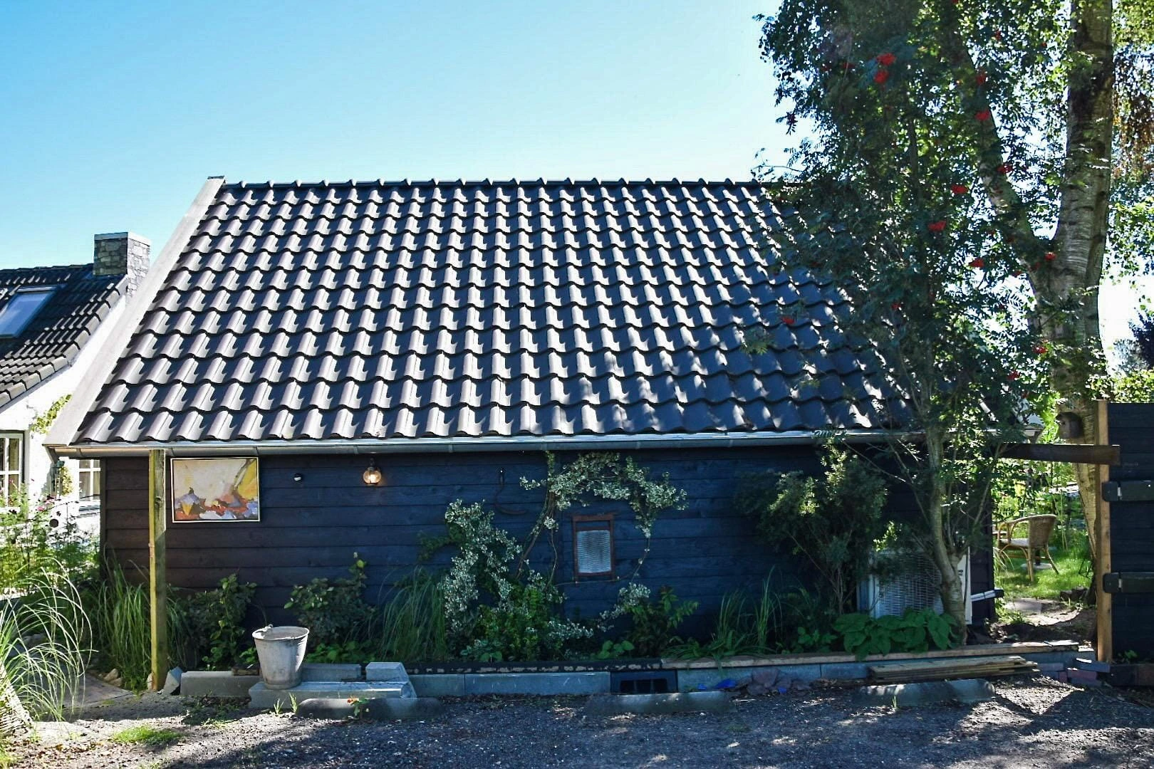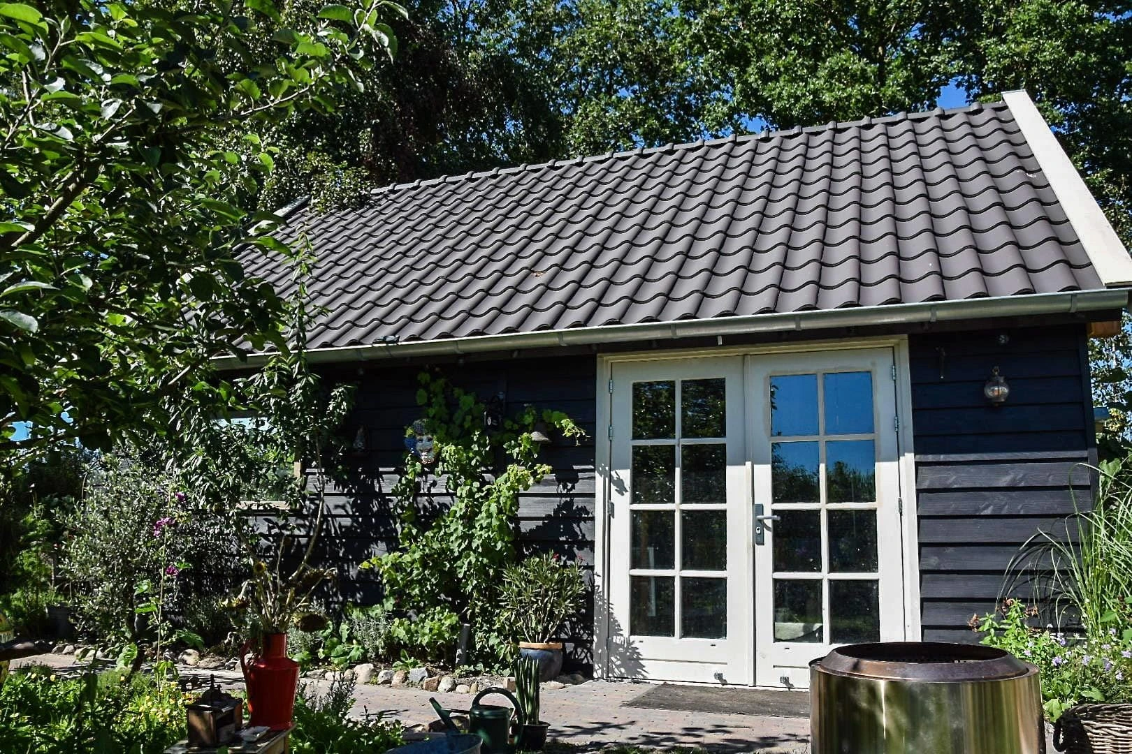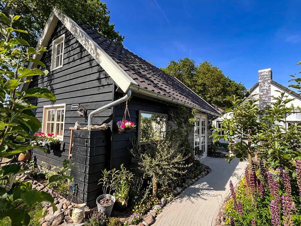 Deze Drentse kapschuur heeft een evenwichtige maatvoering met een royale nokhoogte, wat zorgt voor een open en lichte ruimte. De combinatie van zeven hardhouten ramen en brede Merbau terrasdeuren zorgt voor een sterke verbinding met de buitenruimte en veel natuurlijk daglicht. De constructie van Douglas gevelplanken geeft een natuurlijke en verzorgde uitstraling die goed past bij verschillende tuin- en erfbeelden. De nieuwe keramische dakpannen sluiten het geheel af met een klassieke en tijdloze afwerking. Een functionele en sfeervolle kapschuur waar licht, ruimte en verbinding met buiten centraal staan.