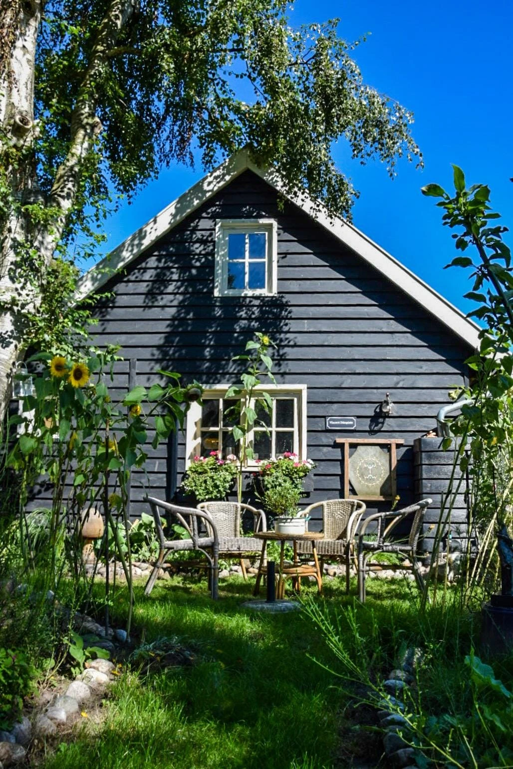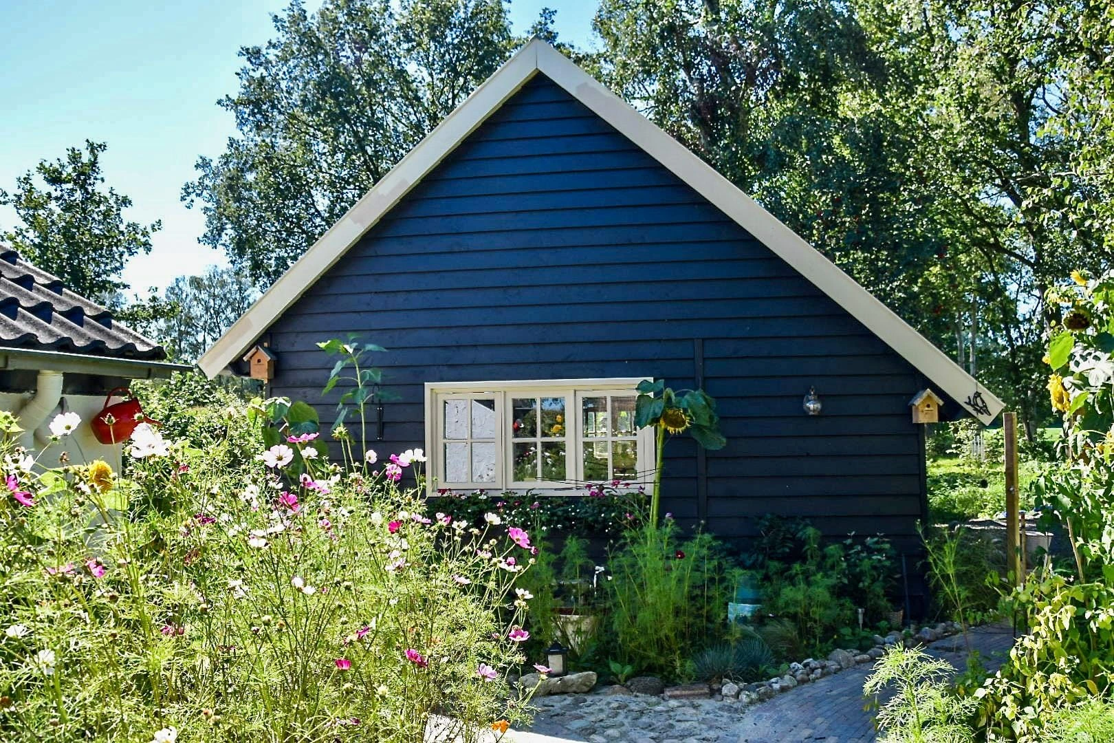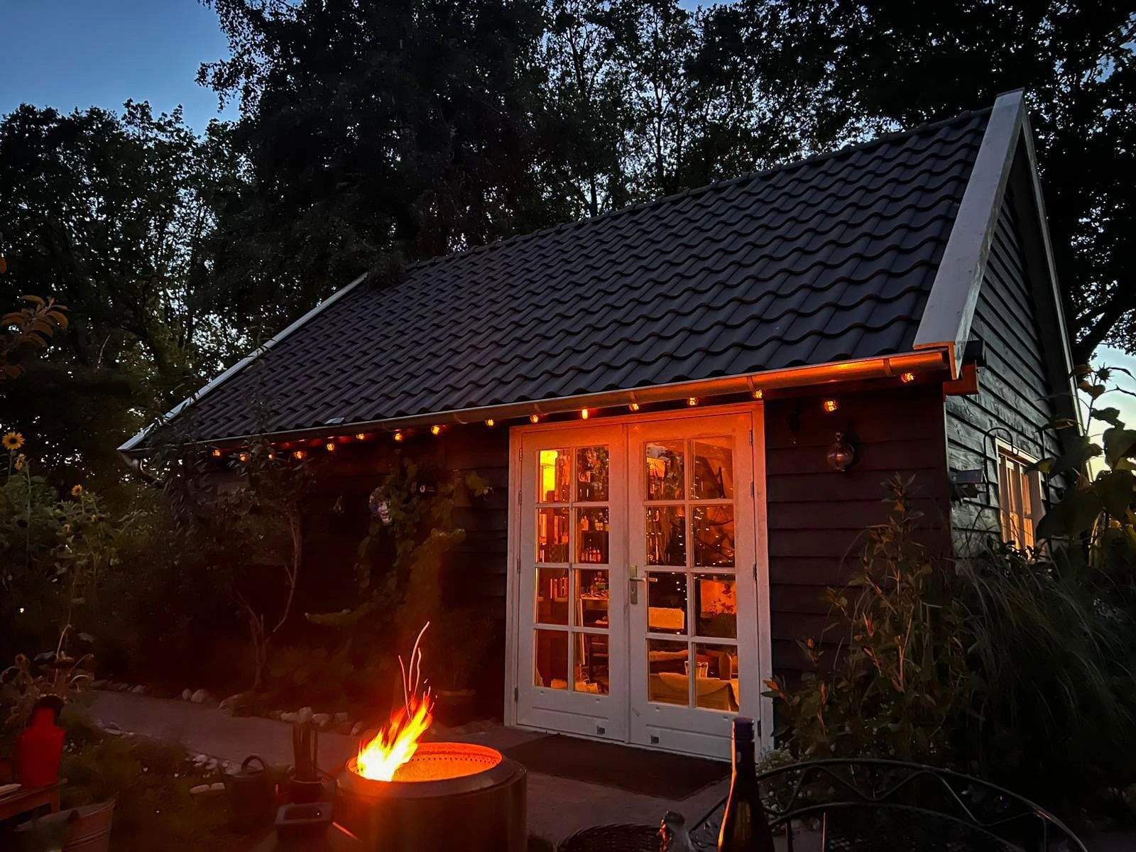 Deze Drentse kapschuur heeft een evenwichtige maatvoering met een royale nokhoogte, wat zorgt voor een open en lichte ruimte. De combinatie van zeven hardhouten ramen en brede Merbau terrasdeuren zorgt voor een sterke verbinding met de buitenruimte en veel natuurlijk daglicht. De constructie van Douglas gevelplanken geeft een natuurlijke en verzorgde uitstraling die goed past bij verschillende tuin- en erfbeelden. De nieuwe keramische dakpannen sluiten het geheel af met een klassieke en tijdloze afwerking. Een functionele en sfeervolle kapschuur waar licht, ruimte en verbinding met buiten centraal staan.